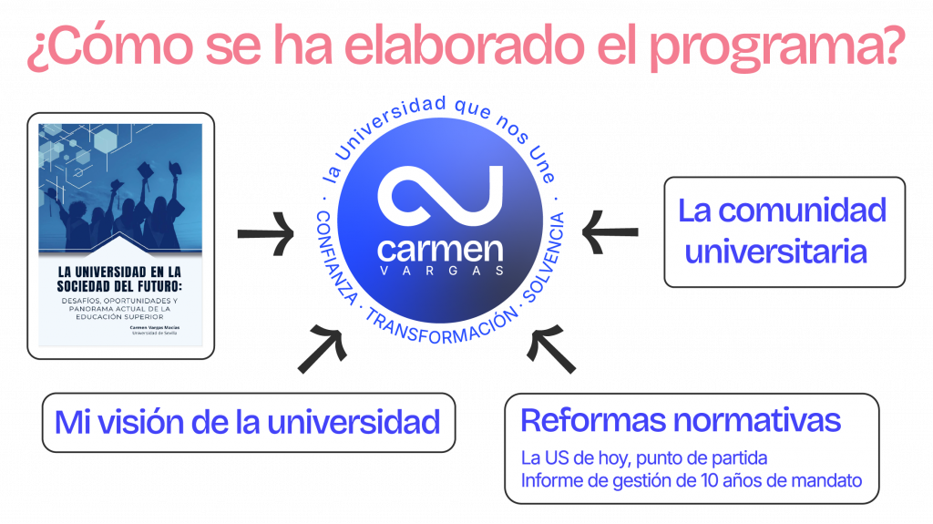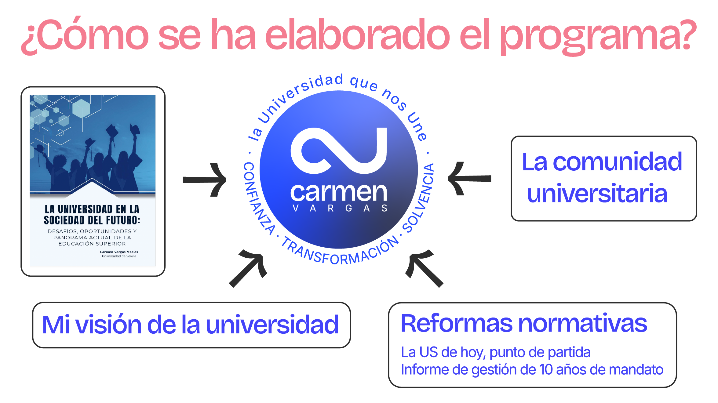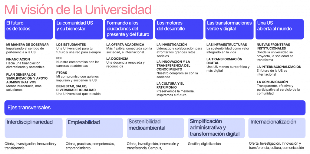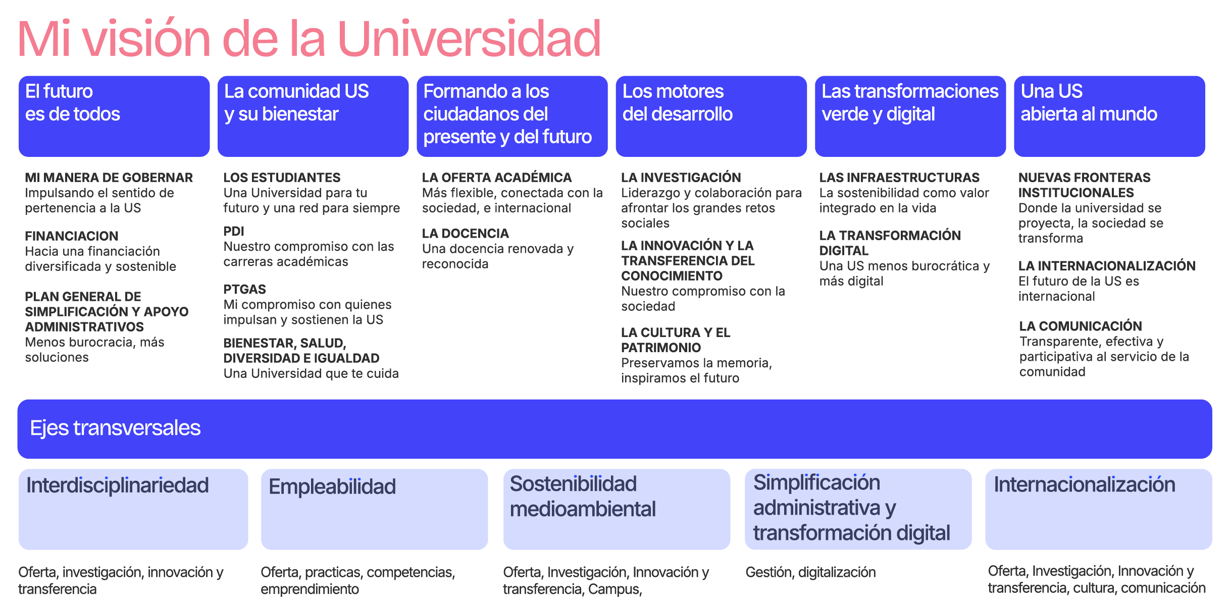 TRANSFORMACIÓN, para que la Universidad de Sevilla sea referente nacional e internacional en docencia e investigación, en innovación y cultura, en digitalización y sostenibilidad, y, sobre todo, en atención al bienestar de su comunidad.
